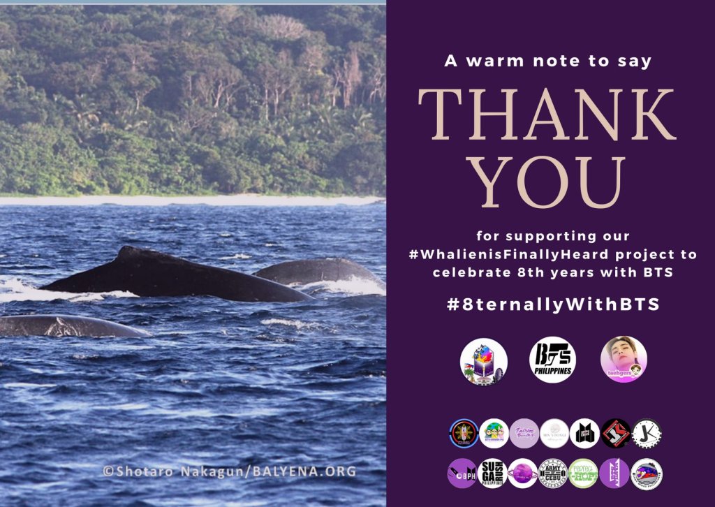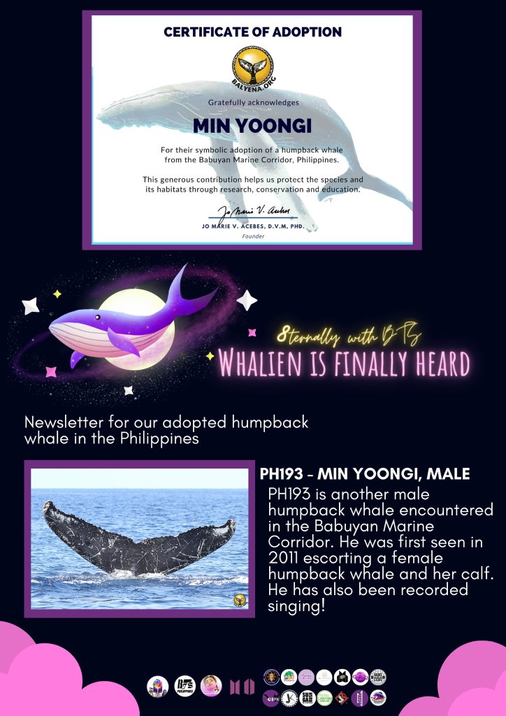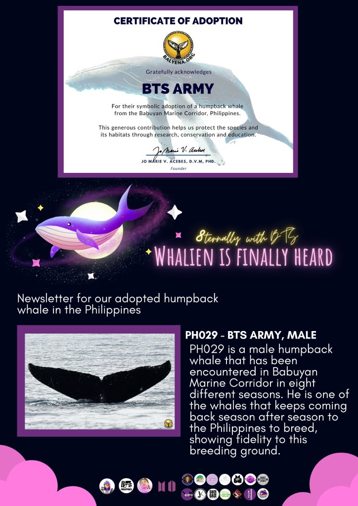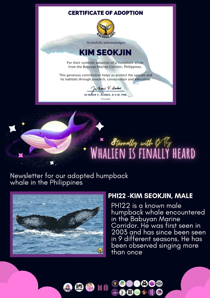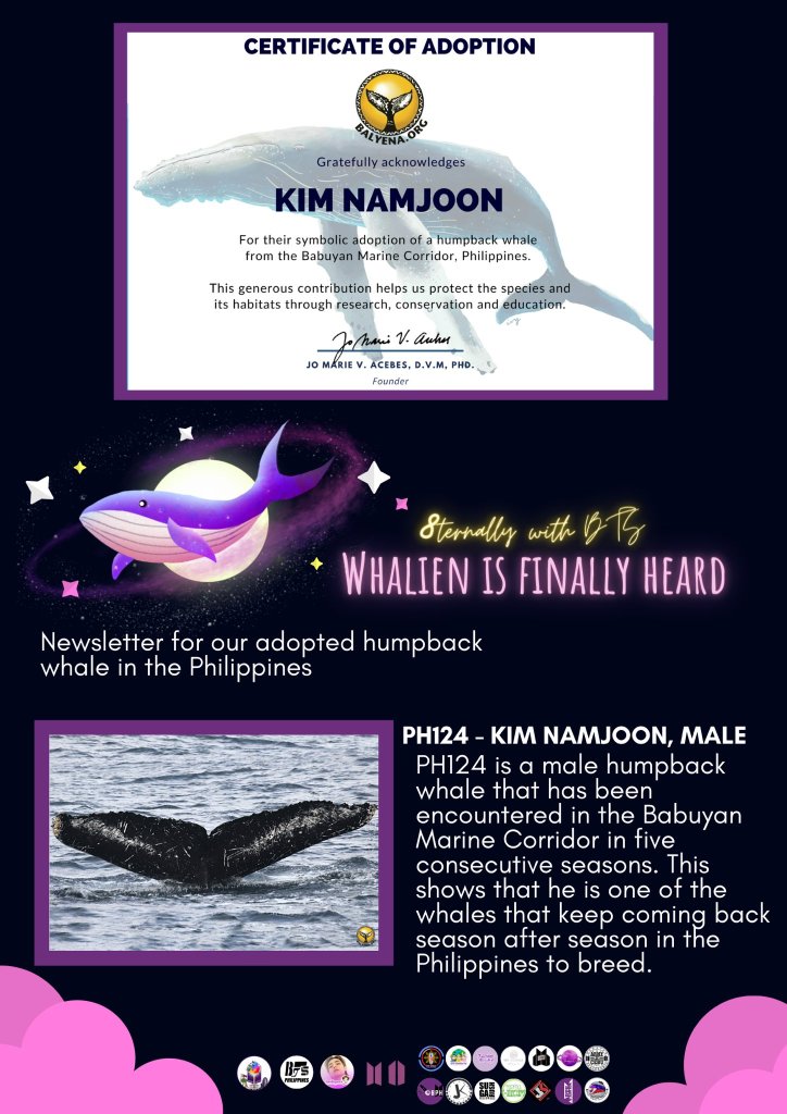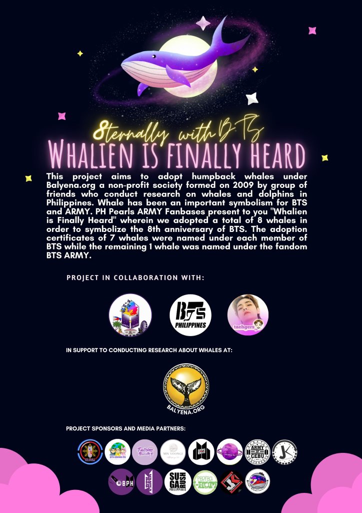 “This project aims to adopt humpback whales under Balyena.org a non profit society formed in 2009 by group of friend who conduct research on whales and dolphins in Philippines. Whale has been an important symbolism for BTS and ARMY. PH Pearls ARMY fanbases present to you “Whalien is finally Heard” wherein we adopted a total of 8 whales in order to symbolize the 8th anniversary of BTS. The adoption certificates of 7 whales were named under each member of BTS while the remaining 1 whale was named under the fandom BTS ARMY”