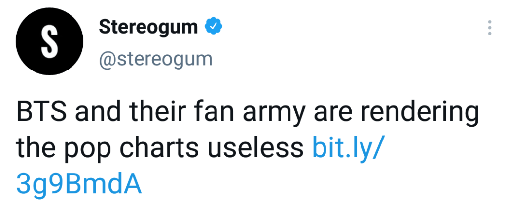 “It’s always interesting to me when tone-deaf articles like this one blatantly ignore the fact that BTS never gets the same industry support as western artists. And when their fans try to make up for that difference, it is deemed “inorganic” If you are so invested in the workings of the music industry and the charts, I urge you to write a wholistic think piece. One that includes factors like Payola, unfair playlisting due to company dealings, bundled etc. All of which “paint a false picture of popularity” Every artists in this industry aims to accumulate a loyal fan base. That ensures security for their career. Why is BTS antagonised for doing so in, arguably, the most successful manner? Big corporations meddling with the process to push their artists is fair. but fans willingly supporting an artist is somehow “inorganic”? Explain to me how that makes sense. Alternatively, you could just accept that BTS succeeding in an industry that offers them no support, pissed you off. You would spare yourself the embarrassment that way.” bts_simp