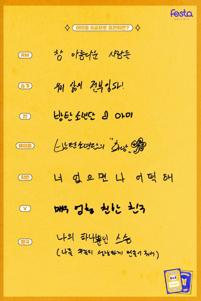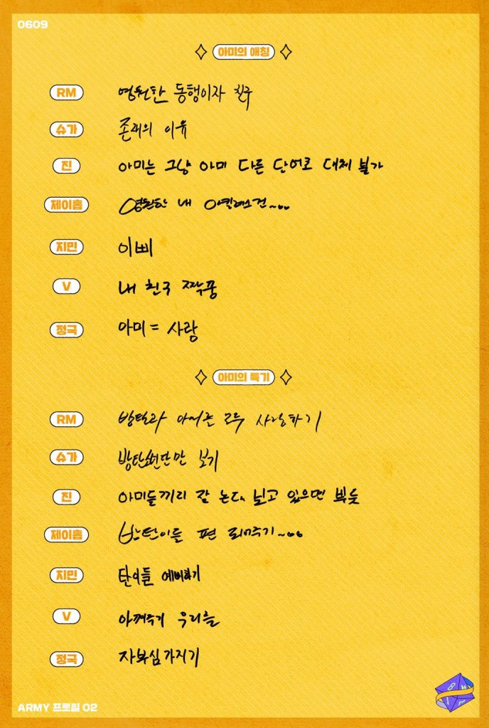 Occupation: at times like a teacher, other times like a friend and the people we love Residence: Here & there, wherever Bangtan’s road is, all over the place
