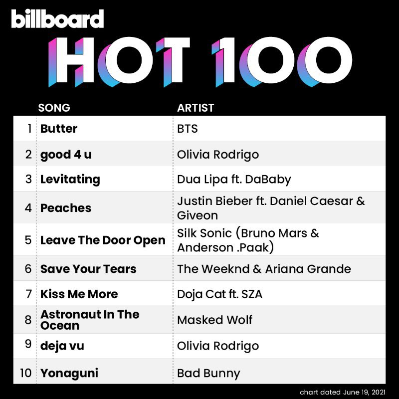 BTS’ “Butter” takes the no. 1 position with 15.4 million streams and 138,400 downloads sold in the week ending 10th June. It also attracted 24.6 million radio airplay audience impressions up by 10% in the week ending June 13th.