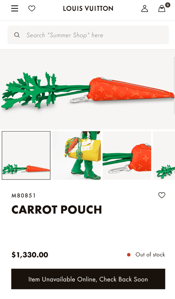 In the photo, he was seen holding a quirky, carrot-shaped Louis Vuitton handbag a bold and whimsical accessory from the luxury brand’s exclusive collection. Within minutes of the post going live, the $1,330 designer bag sold out entirely from Louis Vuitton’s U.S. online store, and it didn’t take long for global stores to follow suit.