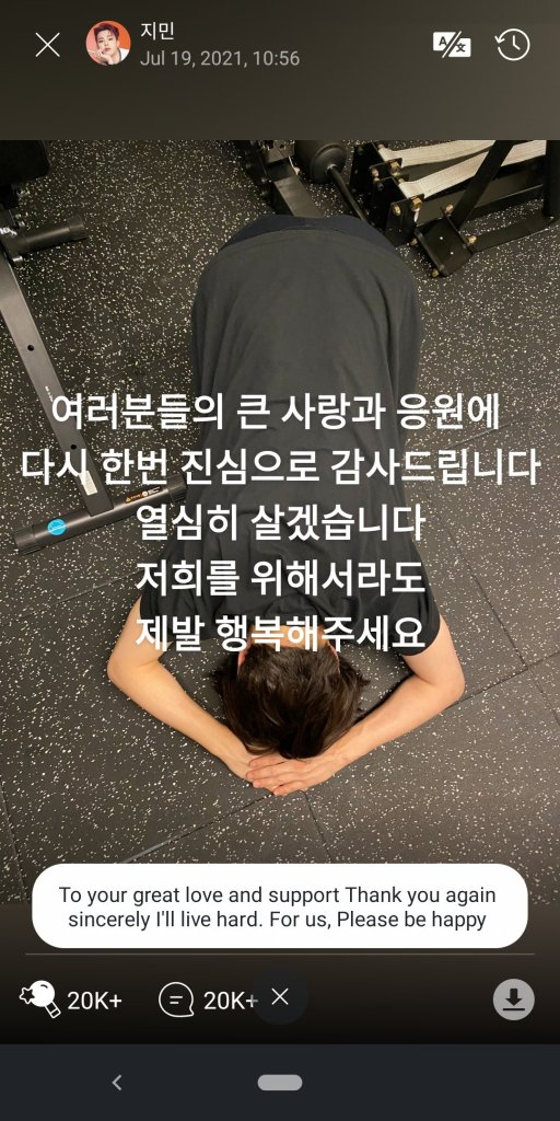 Jimin wrote on Weverse over a picture of him bowing, “Thank you again for your big love and supports from the bottom of my heart, I’ll live life to the full. Please be happy for us.”