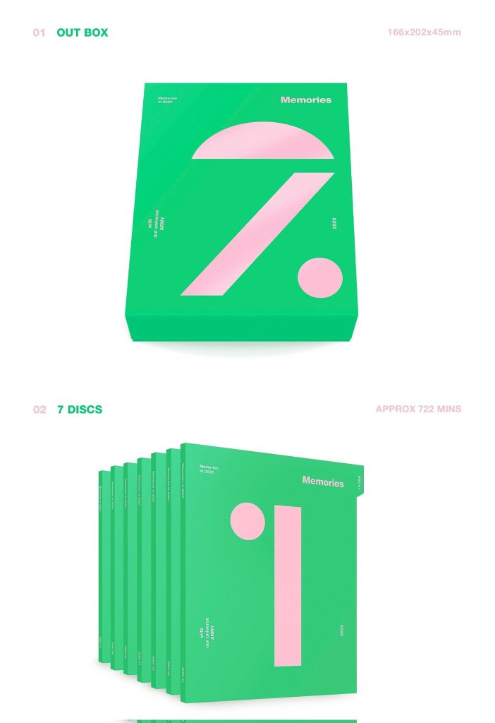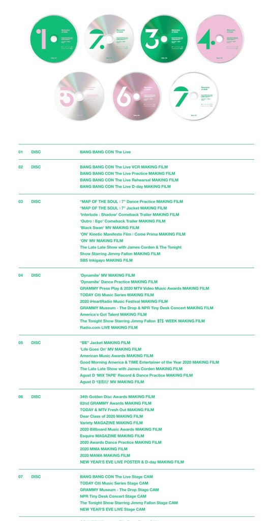To gift ARMYs the “BTS Memories of 2020” consists of 7 discs, approximately 722 minutes (12 hours 2 mins) Content includes: Outbox 7 discs (Sub: KOR ENG CHN, all region) 4×6 photo set (7) Paper photocard frame Photocard (random 1 of 7). BTS Memories of 2020 contents : • 34th Golden Disk Awards • 2020 Grammys • MMA 2020 • Bangbangcon The Live • Dear class of 2020 • ON making sketch • Dance practices • Esquire magazine behinds • Variety • BE album shoots • Daechwita film making • GDA • more magazine behind shoots • mix from dynamite • dynamite promos and more !!!!!!!