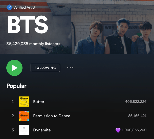 Now, with over 1 billion streams on Spotify, “Dynamite” joins the ranks of iconic global hits such as: