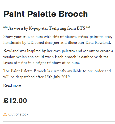 Kim Tae-hyung aka BTS’ V is a lover of art and he is the sold out King, combine that and you get a business that tells a story of being boosted by the “Sweet Night” vocalist wearing an art piece. It all started in June 10, 2019 when independent artist Kate Rowland got flooded with piles of unexpected orders from South Korea and japan for her “Wooden Artists Paint Palette Brooch”. Confused and amazed, she got on the internet to find out the reason of the sudden influx, and the reason was none other than BTS’s V who was seen wearing it at the airport while returning back to Korea multiple times.