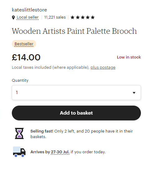Fast forward to 21st July 2021 and the “Wooden Artists Paint Palette Brooch” is still out of stock in one of the major online stores where it is a best seller, and the brooch is selling fast in her online store, with only 2 remaining at the time of writing this article.