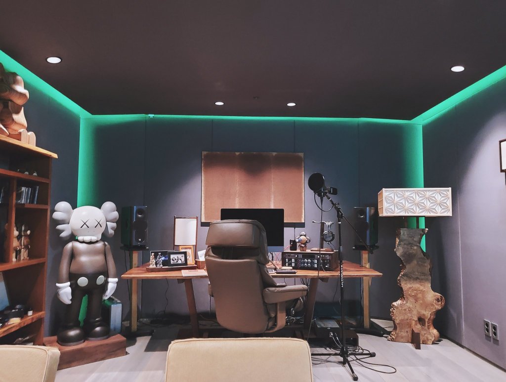 RM’s “Rkive” studio has an earthy tone with shades of brown and orange with a little pop of color from the lighting. The studio is filled with his favourite things, art, wood, figurines, the new studio however has few figurines as compared to his older studio which had a whole display cabinet of the figurines. The presence of art work and sentimental items like the group photo and concert photo shows that for the rapper his studio is not just a place to work but also to chill and reminisce on good memories. His aesthetics are: family (BTS members), kaws, wood art, and plants.