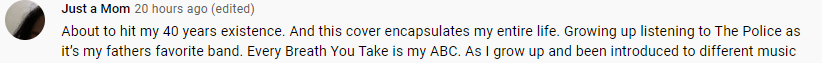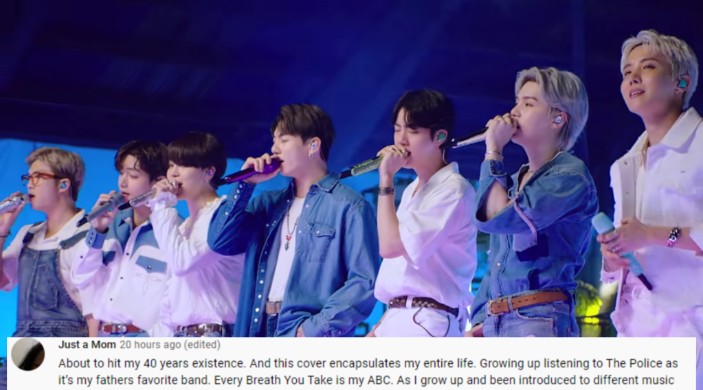 When my Mother died my father keeps playing “Every Breath You Take” since that’s his song for my Mother. He either will listen to that or this song. Before my work started I have my phone volume up listening to the BBC broadcast and this played while my 78 years old father sat down and wiped his tears. Looked at me and said “that kids can really move mountains and touch your soul” I can’t stoped crying knowing how this song means a lot to us as a family. This cover expressed my family’s entire emotions. As this is a very important song and the messaged the BTS conveys hit harder than I thought it will to us. Thank you for making my dad smile even in tears for I know listening to this brings back all the happy memories he had with my Mother.