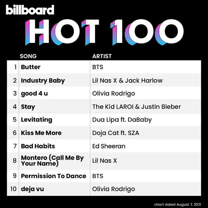 “Butter” by BTS tops the US Billboard Hot 100 Chart for its 9th week! Becoming the longest charting #1 song of 2021! “Butter” gaveway to “Permission to Dance” when it debuted at #1 but tool reign again at #1 this means that BTS has now topped the Hot 100 Chart for 10 consecutive weeks!