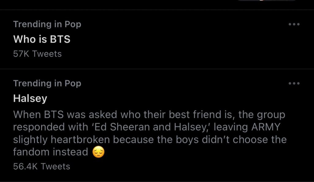 What made the moment even more iconic was the trending description itself. It perfectly captured the energy of the fandom, reading something like: “When BTS was asked who their best friend is, the group responded with ‘Ed Sheeran and Halsey,’ leaving ARMY slightly heartbroken because the boys didn’t choose the fandom instead.” It was both hilarious and wholesome the kind of playful chaos only BTS and ARMY can create together.