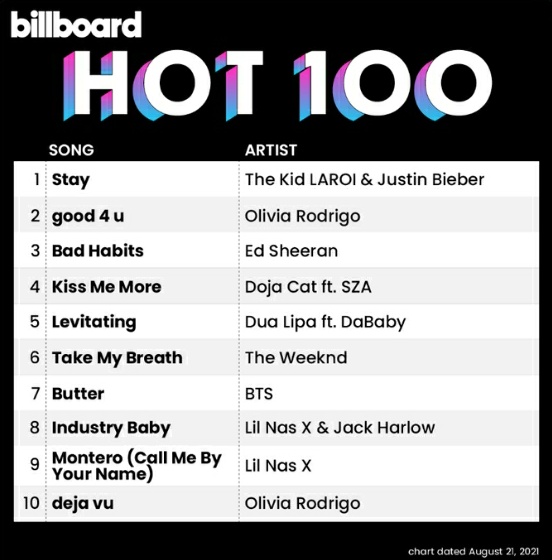 “Butter” by Korean band BTS takes #7 spot on the Billboard Hot 100 Chart spending its 12th week in the top ten thus tying with “Gangman Style” by Psy which also spent 12 weeks. BTS’ very own “Dynamite” holds the record having spent 13 weeks.
