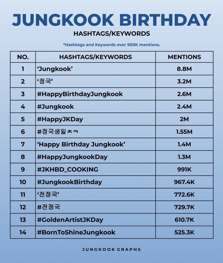 “JungKook’s birthday was a worldwide event as he received lots of love from all quarters, from his BTS members who wrote him birthday messages, to celebrities to ARMY, JungKook ruled the twitter trends from 31st August to 1st September during his birthday celebrations. ‘Jungkook’ had 8.8M mentions, ‘정국’ had 3.2M mentions, #HappyBirthdayJungkook had 2.6M mentions, 8 hashtags/keywords had over 1M mentions while 14 hashtags/keywords had over 500K mentions worldwide.
