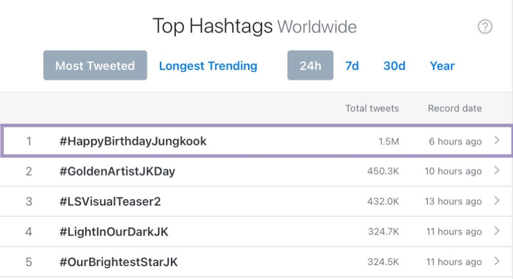 #HappyBirthdayJungkook is the Most Tweeted Hashtag Worldwide in the past 24 hours.