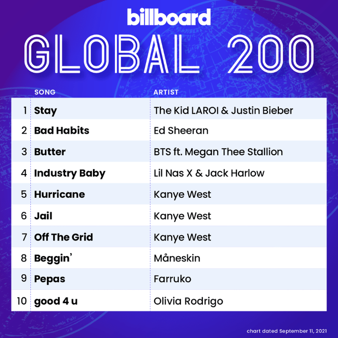 “Butter” (ft. Megan Thee Stallion is #3 on BillboardGlobal 200 and Global Excl. US chart this week!