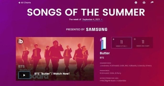 “Butter” gains its 10th Week at No.1 on the Billboard Hot 100, remaining in the chart for 15 weeks. “Butter” is the only song to have 10 weeks at no. 1 in 2021 and the 40th song to do so in the chart’s history. “Butter” is also the top song of the summer in 2021. BTS released “Butter” feat. Megan Thee Stallion on 27th August 2021 which brought more cooler vibes with Megan’s amazing rap skills.