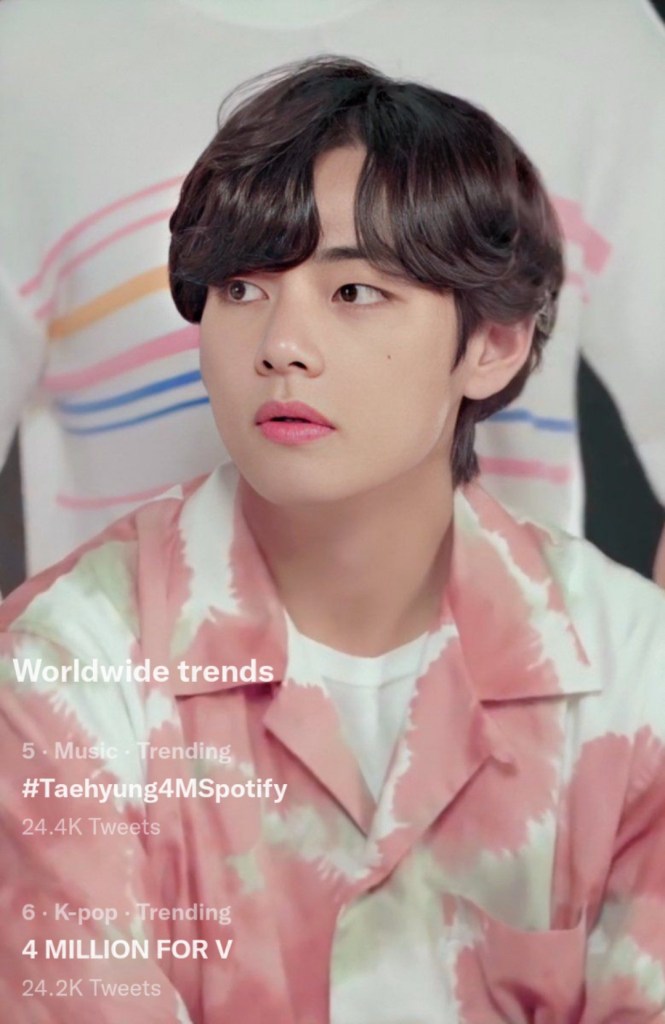 #Taehyung4MSpotify and 4 MILLION FOR V are currently trending as ARMY celebrate the achievement.