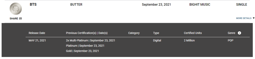 “Butter” is certified double platinum in the United States! According to RIIA (Recording Industry Association of America) the certification criteria for songs are; a song is certified gold after it moves 500,000 equivalent units, platinum at 1 million equivalent units, and double platinum at 2 million units. On September 23, RIAA announced three new certifications for BTS’s hit summer single “Butter”: gold, platinum, and double platinum.