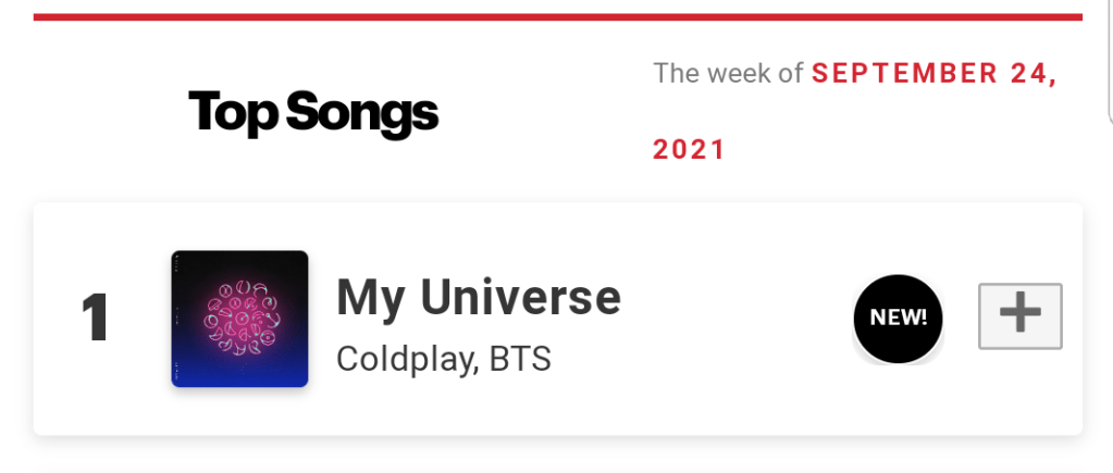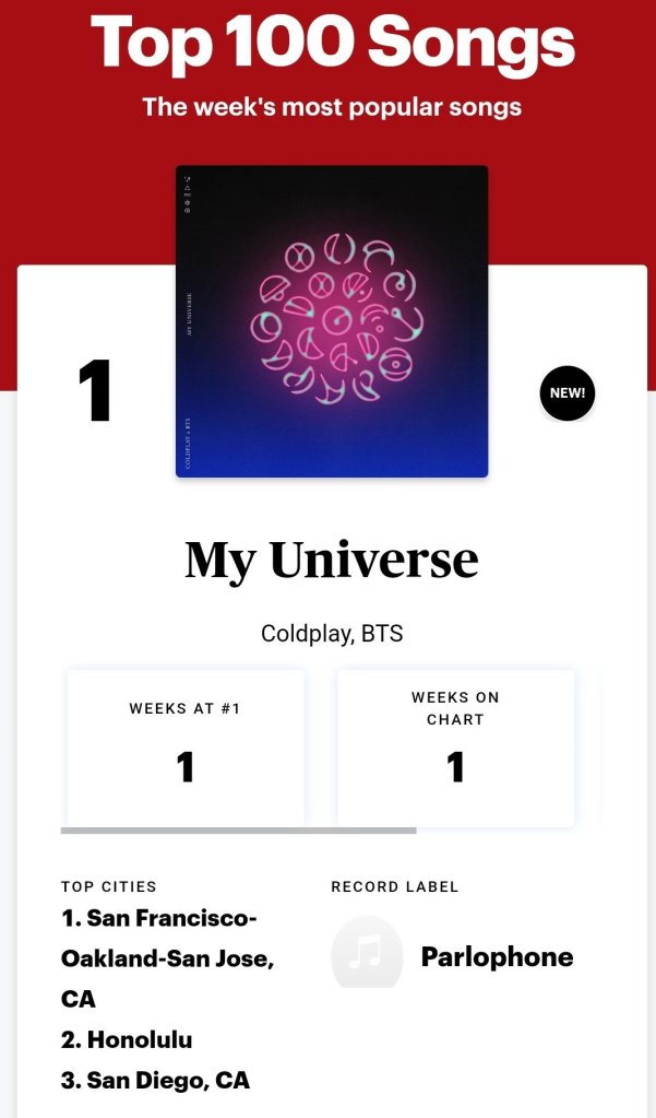 According to Rolling Stone Strong sales helped “My Universe” end the domination of Drakes’s “Way 2 Sexy” on the charts
