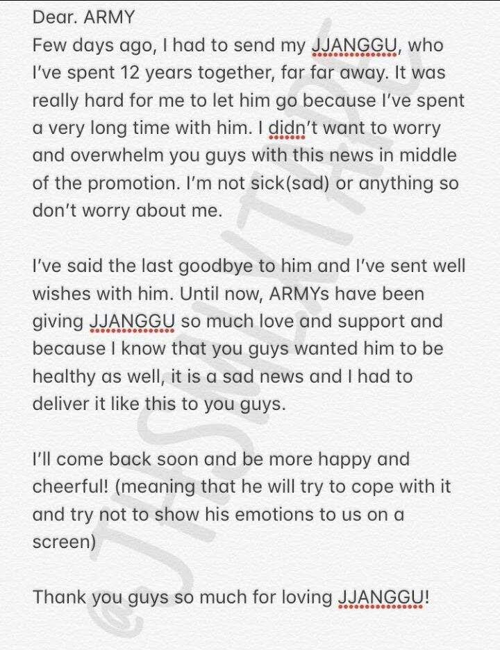 It is heart breaking to loose a pet that you have been with for over a decade and even more sad when you remember the memories but we are glad Jin has family and BTS who have been with him through thick and thin
