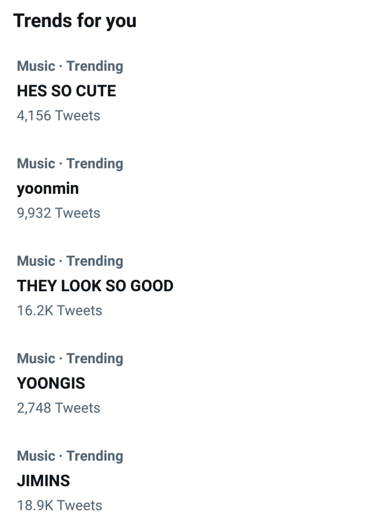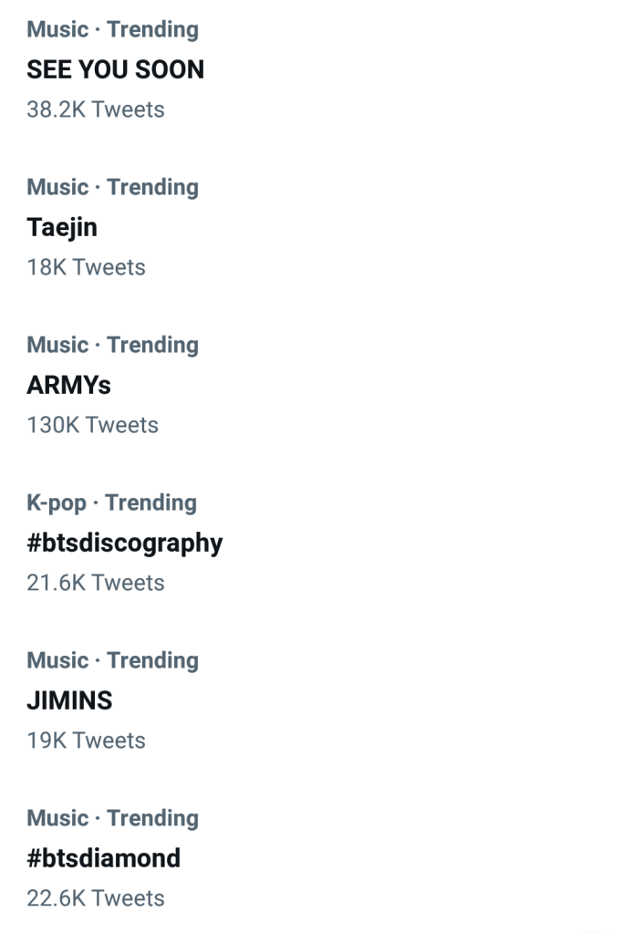 “HE’S CUTE”, “yoonmin”, “THEY LOOK SO GOOD”, “YOONGIS”, “JIMINS”, “Black Swan”, “FASHION KING TAEHYUNG”, “Jhope”, “JEON JUNGKOOK”, “hoseok”, “Tannies”, “#BTSCONCERT”, “JIMIN HIGHLIGHTS”, “#btsdynamite”, “Kookie”, “#btsdivine”, “SEE YOU SOON”, “Taejin”, “ARMYS”, “#btsdiscography”, “#btsdiamond”, “#PTD_ON_STAGE_LA”, “KING TAEHYUNG”, “JIMIN HAS HIGHLIGHTS”, “Jeon”, “LA jungkook”, “JIMIN AIRPORT FASHION”, all dominated the twitter trends for several hours