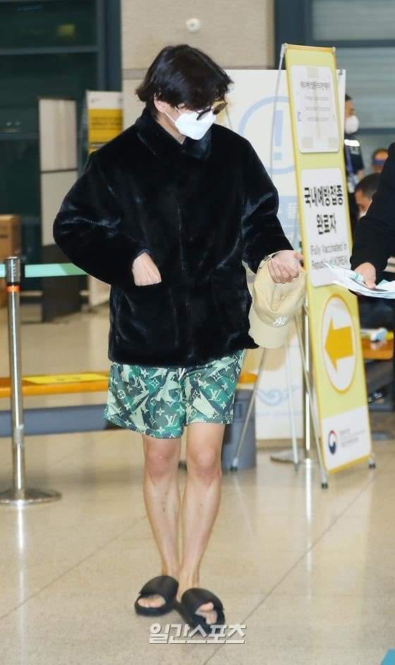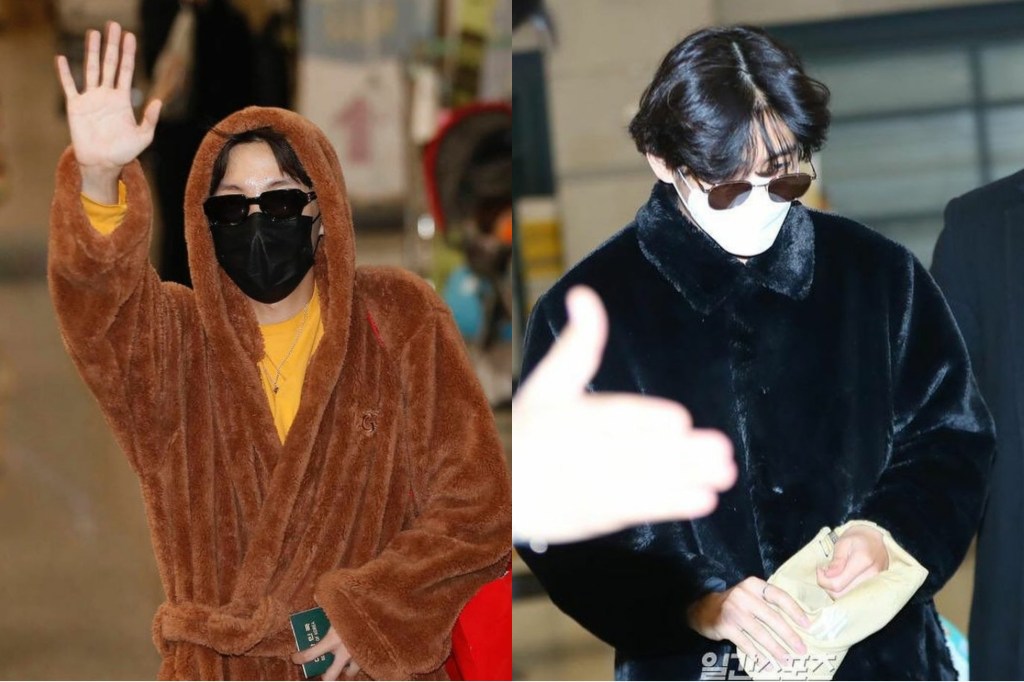 V, on the other hand, stayed true to his soft yet striking visuals. Wrapped in a fluffy ensemble that exuded comfort and understated elegance, he looked both fashionable and warm. His presence at the airport was serene, and he greeted fans and media with his usual calm and polite demeanor.