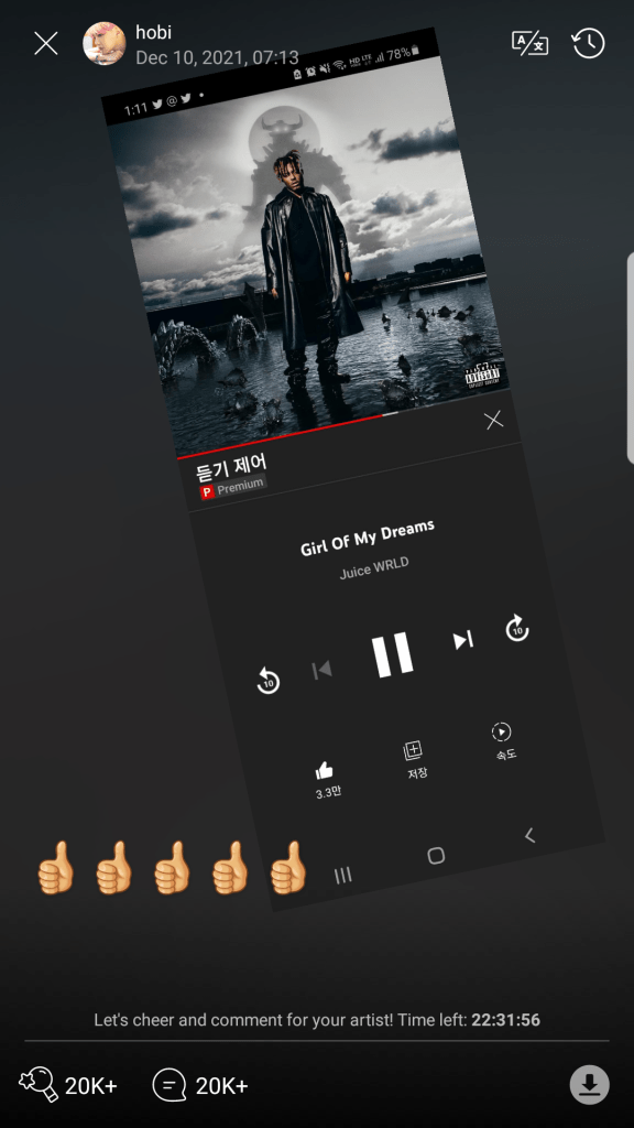 On December 10th, j-hope once again showed his unwavering support, this time for SUGA’s collaboration on a track from the late rapper Juice WRLD’s posthumous album “FIGHTING DEMONS.” The track titled “Girl Of My Dreams” features SUGA, and j-hope shared a screenshot of the song on his Instagram. His caption radiated pride and admiration, a simple gesture that spoke volumes about their bond.
