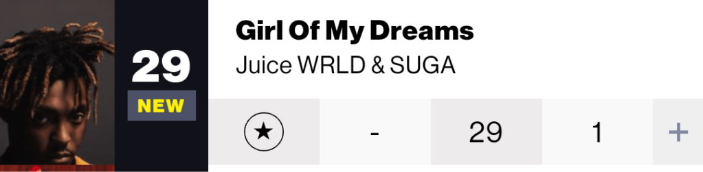 “BTS’ SUGA earned his first career solo entry on the Billboard Hot 100 chart this week at 329 with “Girl of My Dreams” a song he was featured from the Late Juice WRLD’S posthumous album “Fighting Demons” which was released on 10th December 2021. The song is also this week’s top selling song in the US. According to Billboard the song sold just over 40,000 copies in the U.S. in its first full tracking frame of availability. SUGA is now the 2nd highest charting Korean Soloist on the Billboard Hot 100 US (#29).