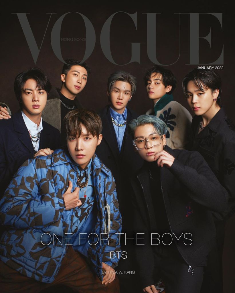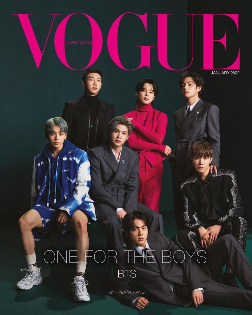 “BTS in Vogue Hong Kong’s January cover star! With 2 covers and a spectacular 44 page spread, the global music sensation makes history in Vogue Hongkong as the first ever male cover stars! All rocking Louis Vuitton SS22 Menswear collection by the late Virgil Abloh. The seven members RM, Jin, SUGA, j-hope, V, Jimin and JungKook have taken the world by storm since their debut in 2013. Vogue Hong Kong’s January 2022 issue will be available on Jan 3 in newsstands and convenience stores in Hong Kong” Vogue Hong Kong