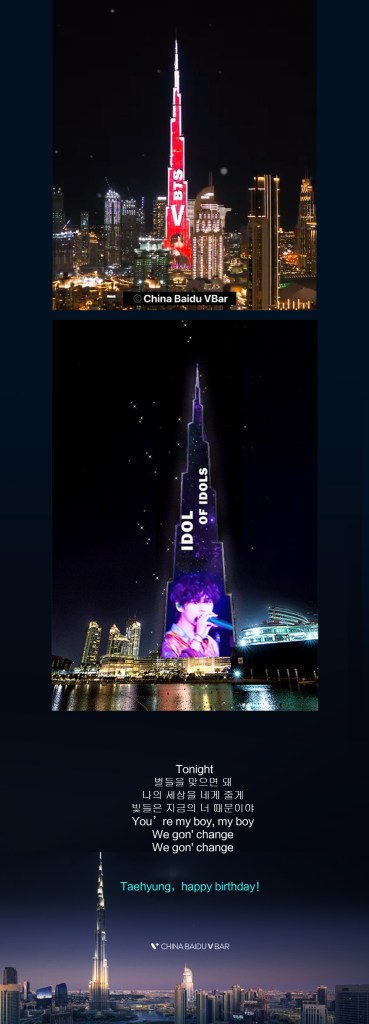 “December 30th will be BTS V’s birthday and ARMY have been preparing for the big event. BTS V’s large Chinese fanbase “CHINA Baidu Bar” in conjunction with “UAE_BTSV” is for the second year in a row have a full birthday ad for the “Christmas Tree” OST singer on the tallest building in the world, Burj Khalifa. As such V is the only idol to have appeared on the building for two consecutive years. Last year V had the ad with a back ground of his song “Winter Bear”