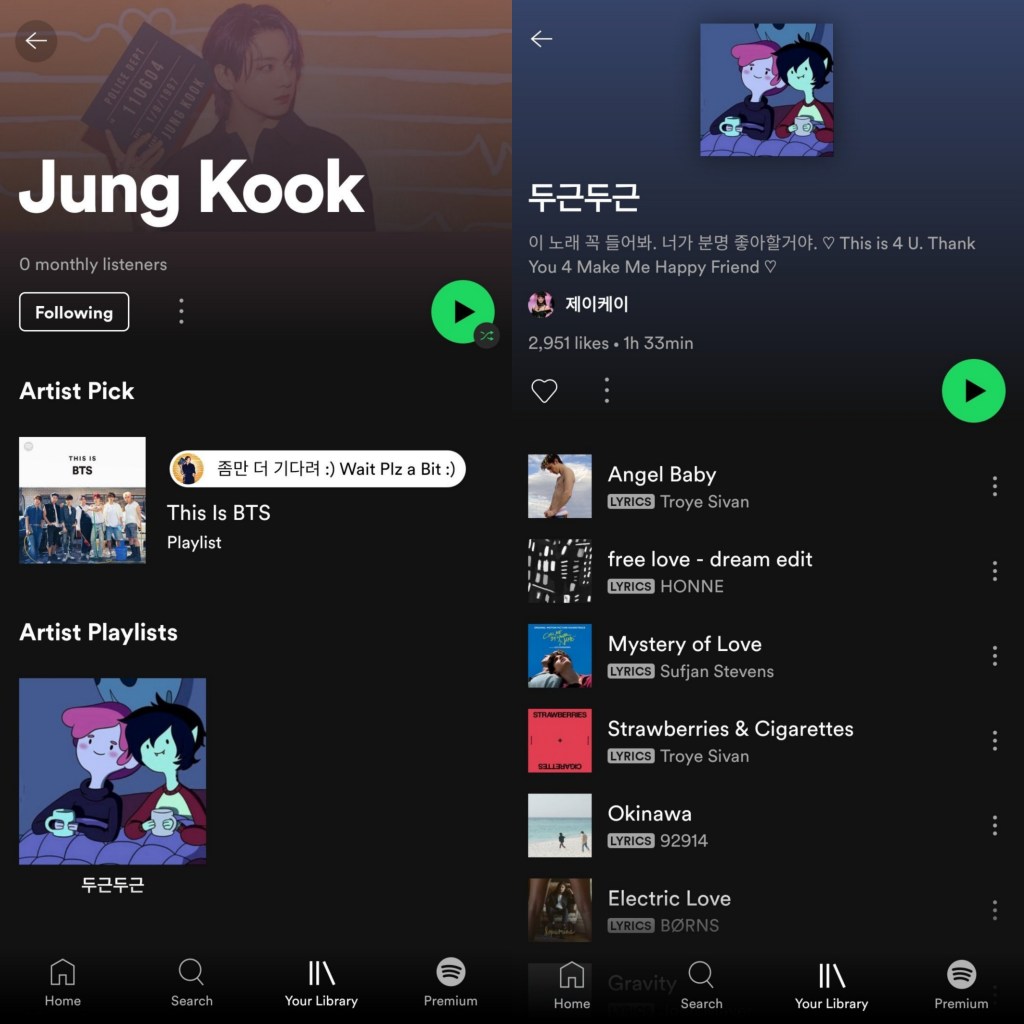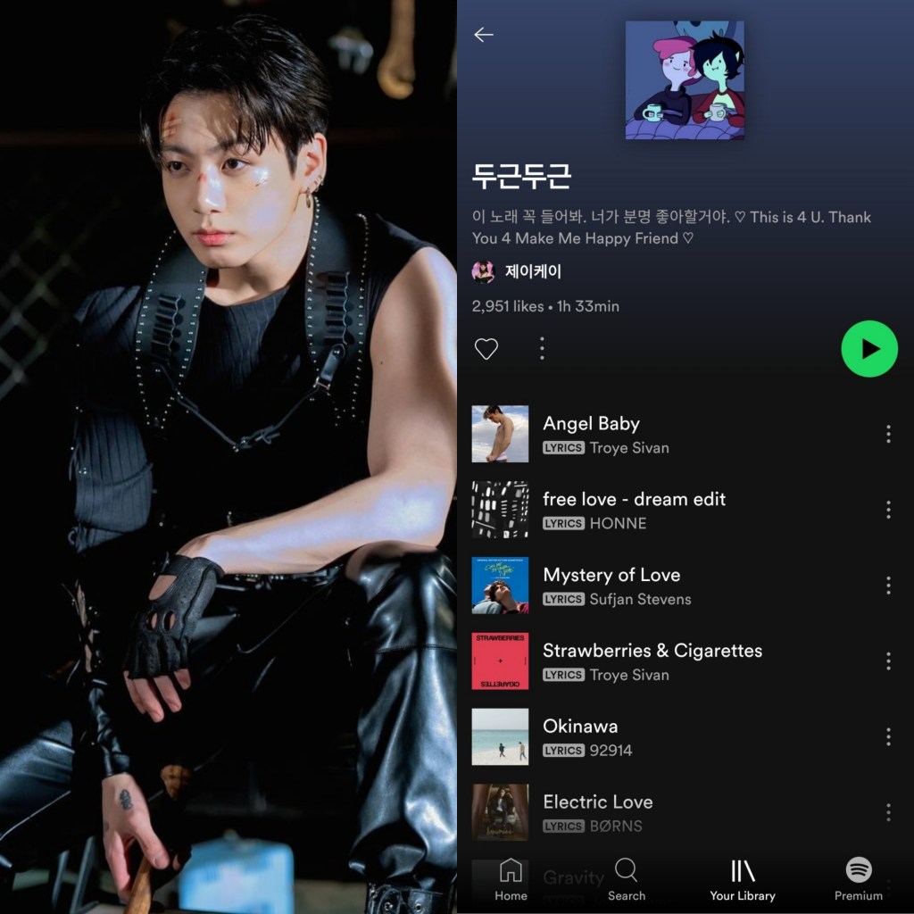 “Jungkook just added a playlist to his Spotify account that includes songs like: ‘Strawberries and Cigarettes’ by Troye Sivan, ‘Gravity’ by John Mayer, ‘Sweet’ by Cigarettes After Sex, and ‘Adore You’ by Harry Styles!!”