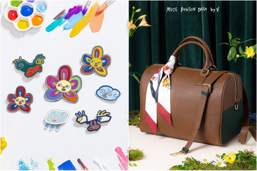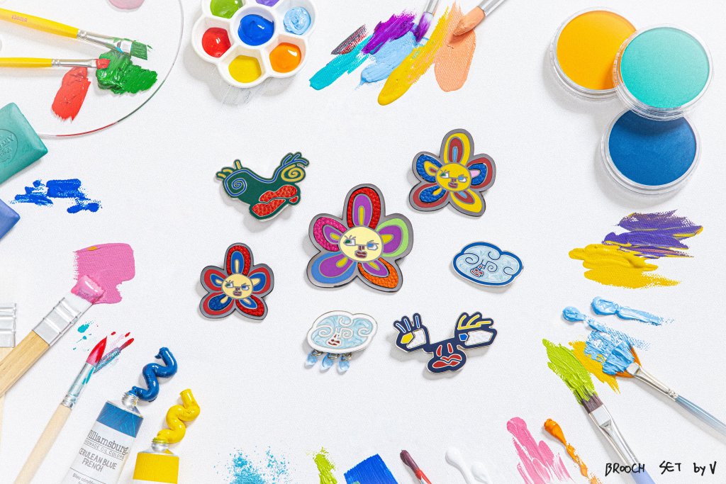“The third member to release their “Artist-made collection by BTS” is V who has released a luxurious looking bag Mute Boston Bag and a set of colorful Brooches (flower buddies, cloud drops and faces) inspired by his love of art. The bag has V’s signature bright scarf, V loves scarfs in different colors and styles. The scarf is tied on its handles while the Brooches are carved to some of his paint art work that he has done in the past.