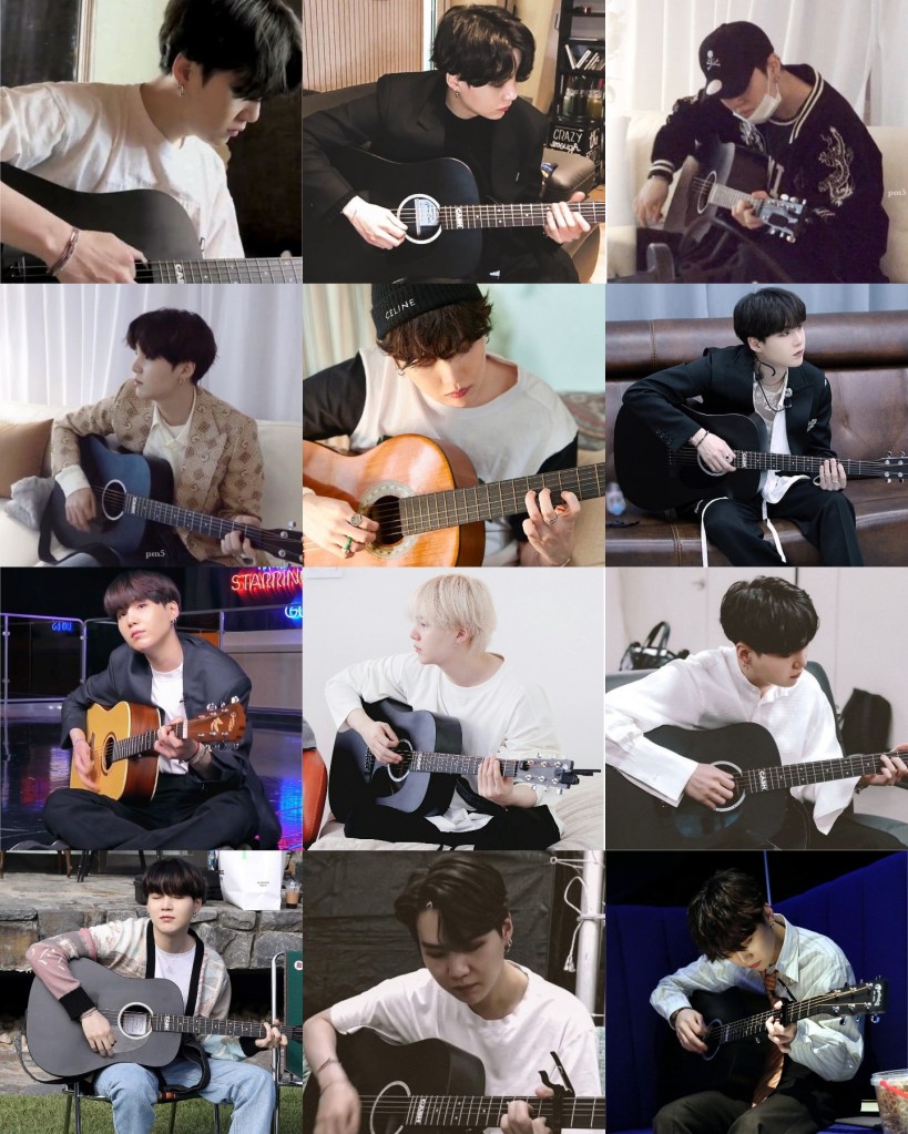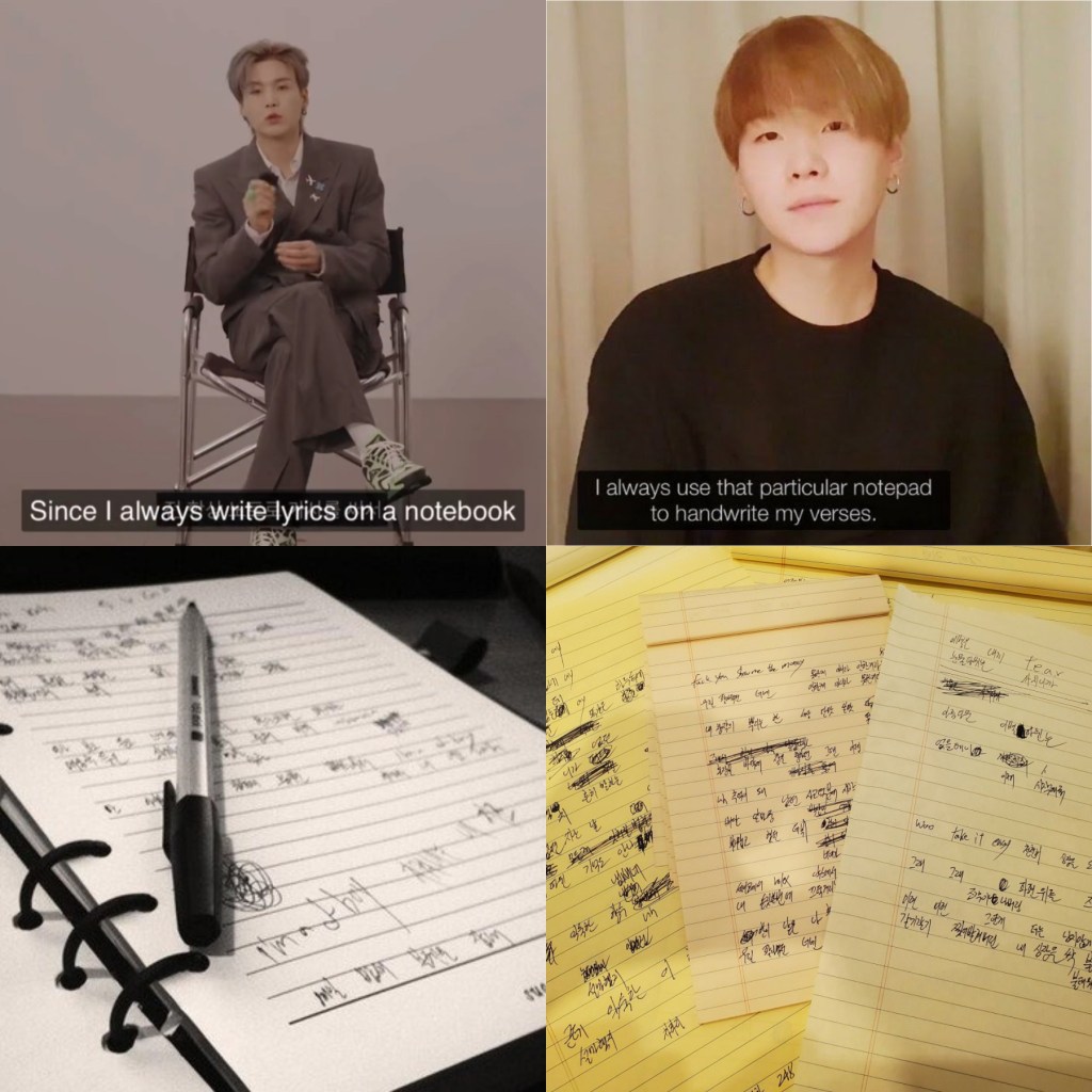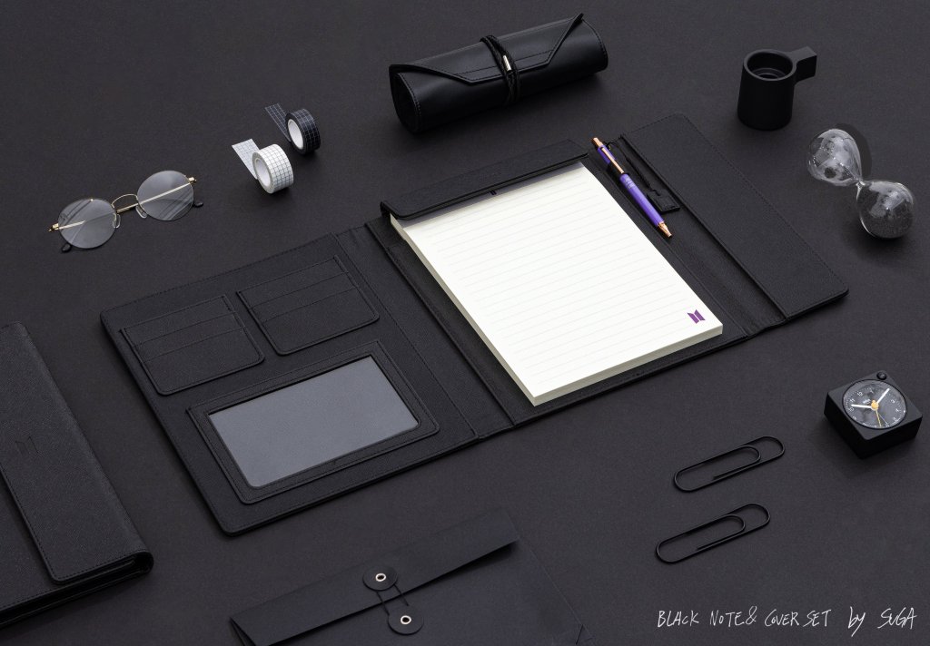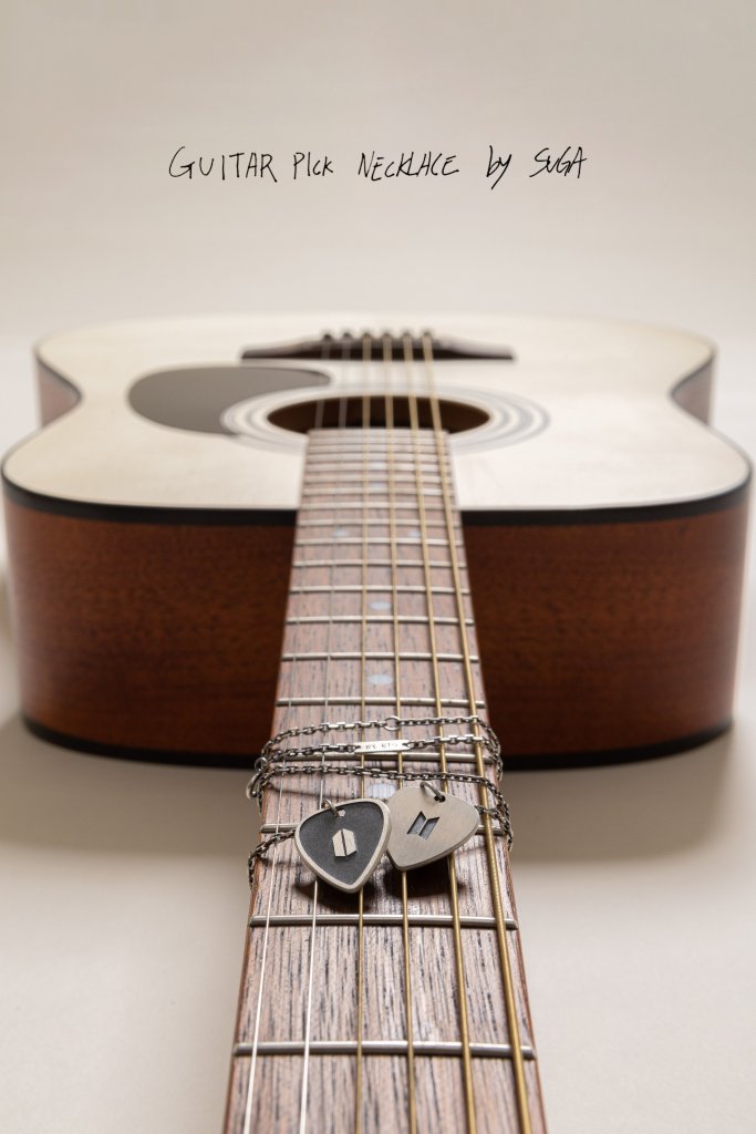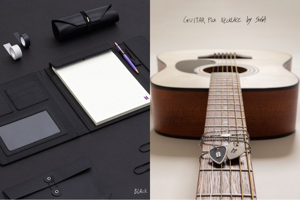 “The fourth member to release their “Artist-made collection by BTS” is SUGA who has released Guitar Pick Necklace + Black Note Plus Cover Set” The merch is so SUGA in all their aspects. SUGA loves music and has been writing his notes in books and he wears mostly all black. He has been learning the guitar that he shared his progress with ARMY during a VLive, his black guitar was donated to HYBE museum. SUGA is also passionate about producing which shows in his merch collection . His intricate details can be seen in the BTS and ARMY logos on the necklace and the purple details on the note set