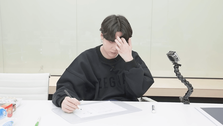 “Personally I think merch like this shouldn’t be so obvious. I want it to be really understated so it wouldn’t look like a fan merchandise. I was thinking about a pick shaped silver necklace. Although you can’t play guitar with this you can still feel like you’re playing a guitar. I want it to be silver that looks used. Not shiny silver but silver that looks a little tarnished and used… yes matte. Oxford notepad plus case, It’ll be one set with the BTS logo and ARMY logo, and a case… use Saffiano leather or something fancy. Fake leather looks too cheap.” SUGA