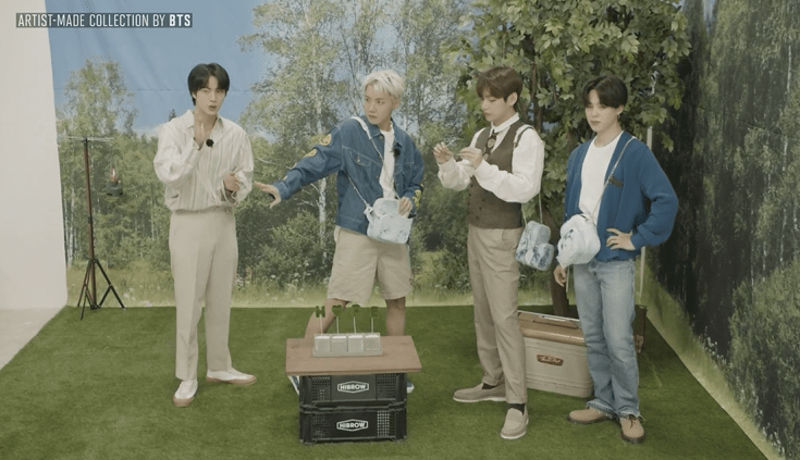 “j-hope introduced his merch collection and was joined by his fellow members Jin, Jimin & V. j-hope’s merch includes Hope Pot Set and Side by Side Mini Bag. For the show j-hope’s MC was Jin who did a great job making the rapper laugh throughout the episode, models (VMin) V and Jimin posed with j-hope’s side by side mini bags. j-hope talked about designing the bags because he carries that type of bag often and the pot sets were so that when you look at them you will be reminded of him. For the bags he wanted something practical but fashionable as well. Watch the full show HERE