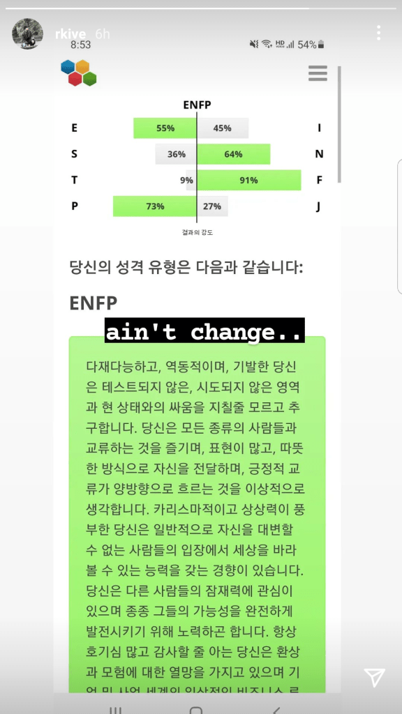 “BTS’ RM posted his “enfp personality” test and captioned it, “ain’t change..” The ENFP personality type is one of the 16 different types identified by the Myers-Briggs Type Indicator (MBTI). This acronym stands for Extraverted, Intuitive, Feeling, and Perceiving.The test determines your personality in different categories. You can try yours here. In psychology, personality type refers to the psychological classification of different types of individuals. ENFPs You Might Know: Andy Kaufmann, comedian, Dr. Seuss, children’s author, Salvador Dali, artist, Ellen Degeneres, comedian and talk show host, Ron Weasley, Harry Potter.