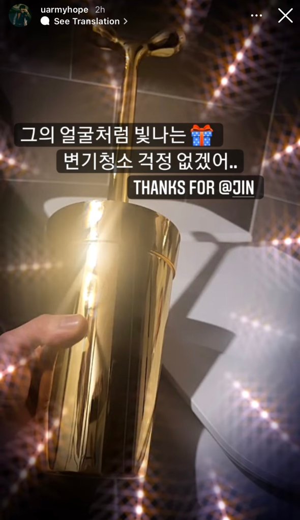 “Jin of BTS is keeping up with tradition of being the first member to with the other members of the band a happy birthday. J-Hope shared on his Instagram stories the gifts he received from Jin. The vocalist got the rapper a birthday cake, a golden toilet scrabber which j-hope tagged “no more trouble cleaning toilet” and a gift bag with what seemed to be various chocolate types. It is just a couple of hours until j-hope’s birthday on 18th February. Check out the gifts below