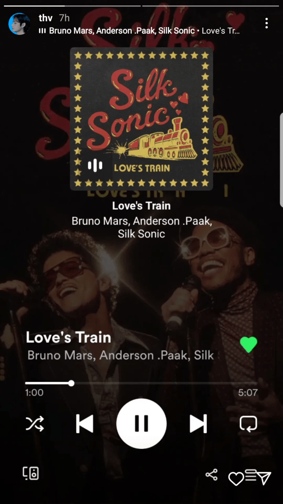 “BTS’ V loves classic music, he has shared his love for the golden oldies on his instagram, he has mentioned classic musicians at interviews and he enjoys playing classical instruments. He recently shared on his instagram account the song he was listening to. It was “Love’s Train” (Con Funk Shun Cover) by Bruno Mars, Anderson .Paak, Silk Sonic. The song has a smooth jazzy feel to it and the sounds of the instruments stand out in the slow ballad.