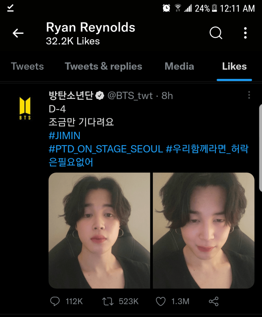 Reynolds joins the 1.3 million individuals who like Jimin’s post, the world in Jimin’s oyster!