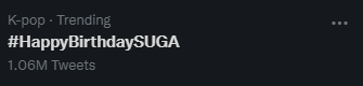 South Korean Trends, #1.HAPPYSUGADAY #4. #기적처럼와준_윤기_생일축하해 (Coming like a miracle_yoongiHBD) #5. #우리의별_우리의우주_윤기_생일축하해 (Our star, our universe, yoongi, Happy birthday.) #9. #AGUSTD and #12. “윤기 생일” (Yoongi’s birthday) ‘THE CAKE’, ‘Min Yoongi’ and ‘HAPPY BIRTHDAY YOONGI’ are currently trending worldwide.