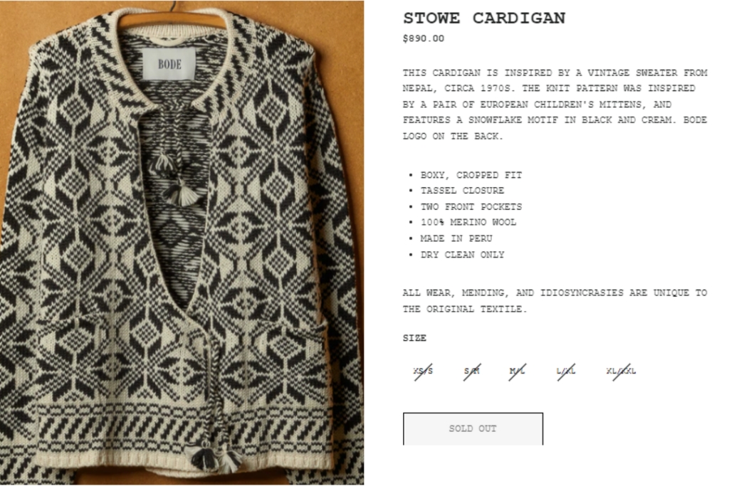 According to Bode the cardigan is inspired by a vintage sweater from Nepal, circa 1970s. the knit pattern was inspired by a pair of European children’s mittens, and features a snowflake motif in black and cream.