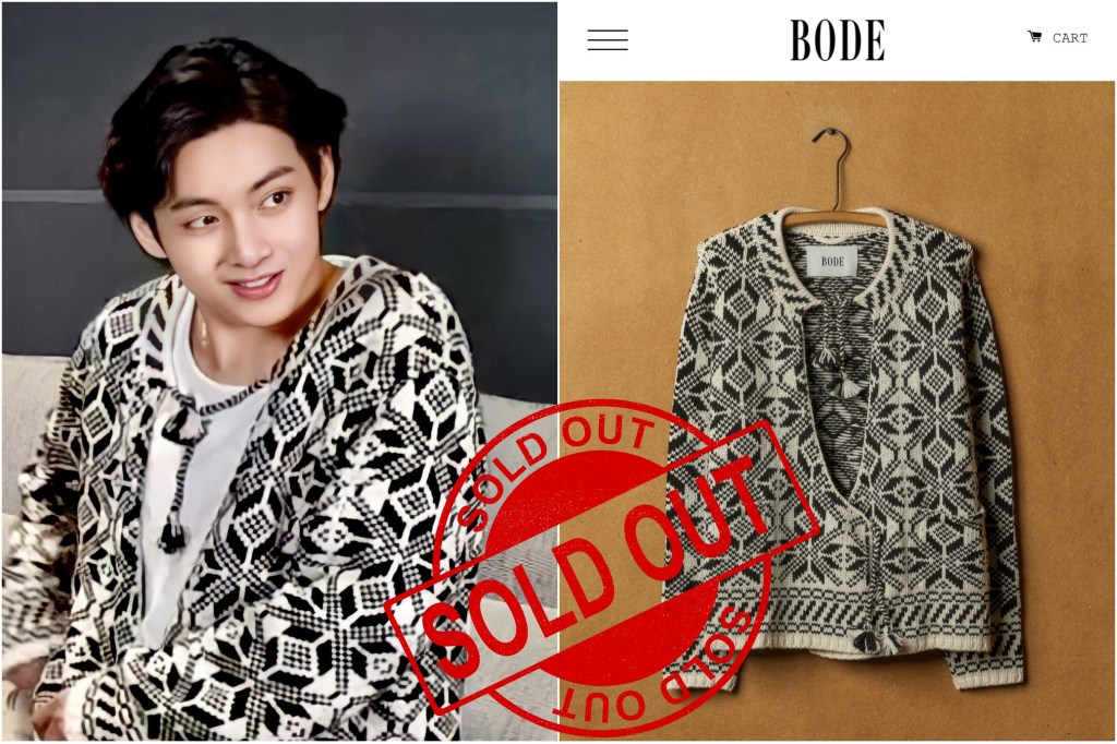 Each member was dressed in their own style and brand. BTS’ V print cardigan stood out with its uniqueness and design. The cardigan is from the brand BODE that the members have all worn at one time or another. As soon as the VLIVE ended V’s cardigan was sold out is several sizes but now 9th March ALL sizes on their website are all sold out!