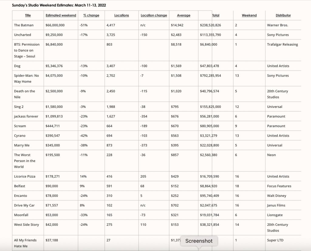 “BTS’ Permission to Dance on Stage,” live streaming concert in Seoul that was screened Saturday 12th March in 800 cinemas with a premium ticket price of $35 grossed $7 million to become the highest grossing live cinema event in box office history and taking the No. 3 spot on the box office charts. According to The Hollywood Reporter, Trafalgar Releasing handled distribution for the event, which is the fourth BTS concert since 2018 that the company has brought to theaters. The event recorded $32.6 million globally grossed across 75 countries.