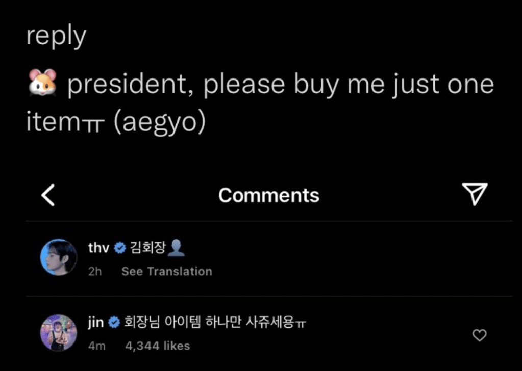 Jin has commented on V’s post and he has a request from the president