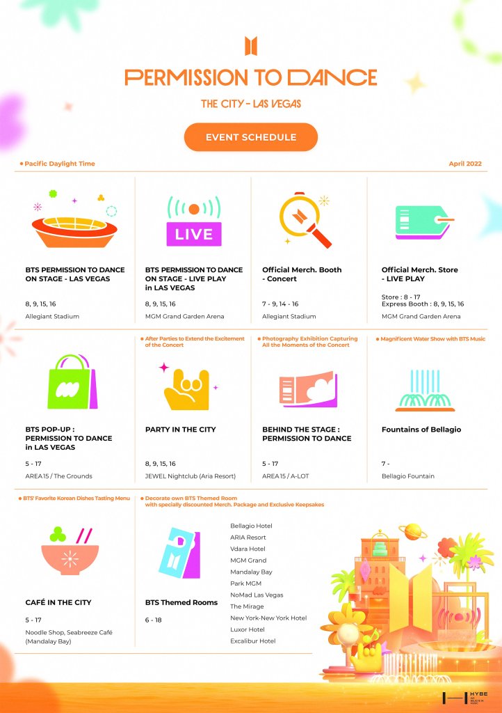 “Introducing BTS PERMISSION TO DANCE THE CITY – LAS VEGAS, where various programs with things to see and play as well as good eats throughout Las Vegas is waiting for you to celebrate BTS PERMISSION TO DANCE ON STAGE – LAS VEGAS. We are doing our best to provide a safe and enjoyable experience for everyone in compliance with the healthcare guidelines, so please stay tuned.” HYBE