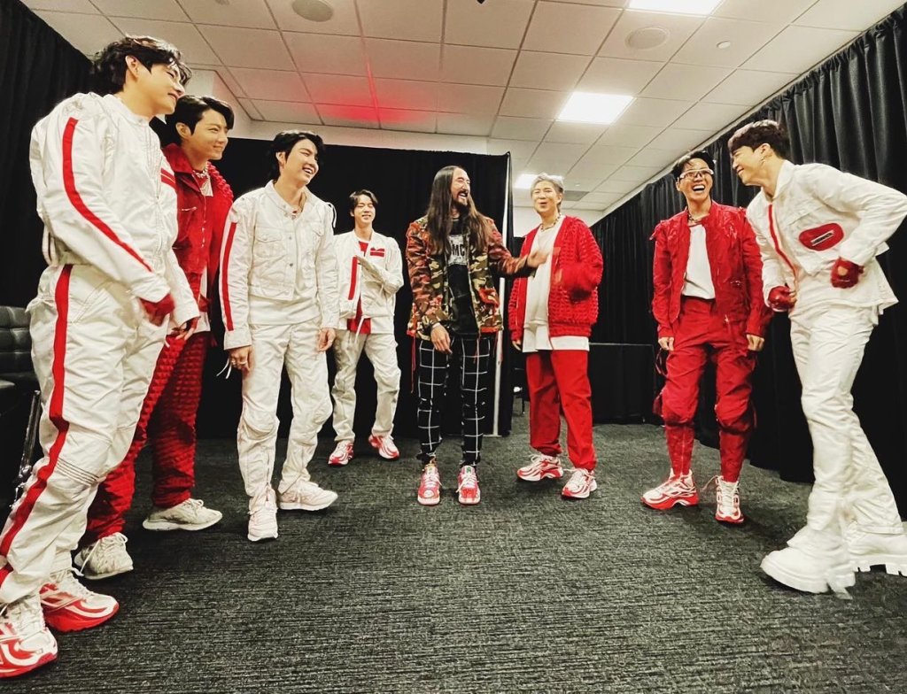“BTS met up with Steve Aoki before their “Permission to Dance on stage” performance in Las Vegas. BTS have collaborated with BTS on several song that include “MIC Drop” wich surpassed 1 billion views, “Waste it on Me” Aoki is an American DJ, record producer, music programmer, record executive. He has collaborated with artists such as will.i.am, Afrojack, LMFAO, Linkin Park, Iggy Azalea, Lil Jon, blink-182, Laidback Luke, BTS, Monsta X, Louis Tomlinson, Backstreet Boys, Rise Against, Vini Vici, Lauren Jauregui, and Fall Out Boy and is known for his remixes of artists such as Kid Cudi.
