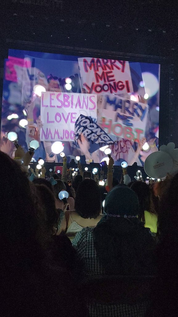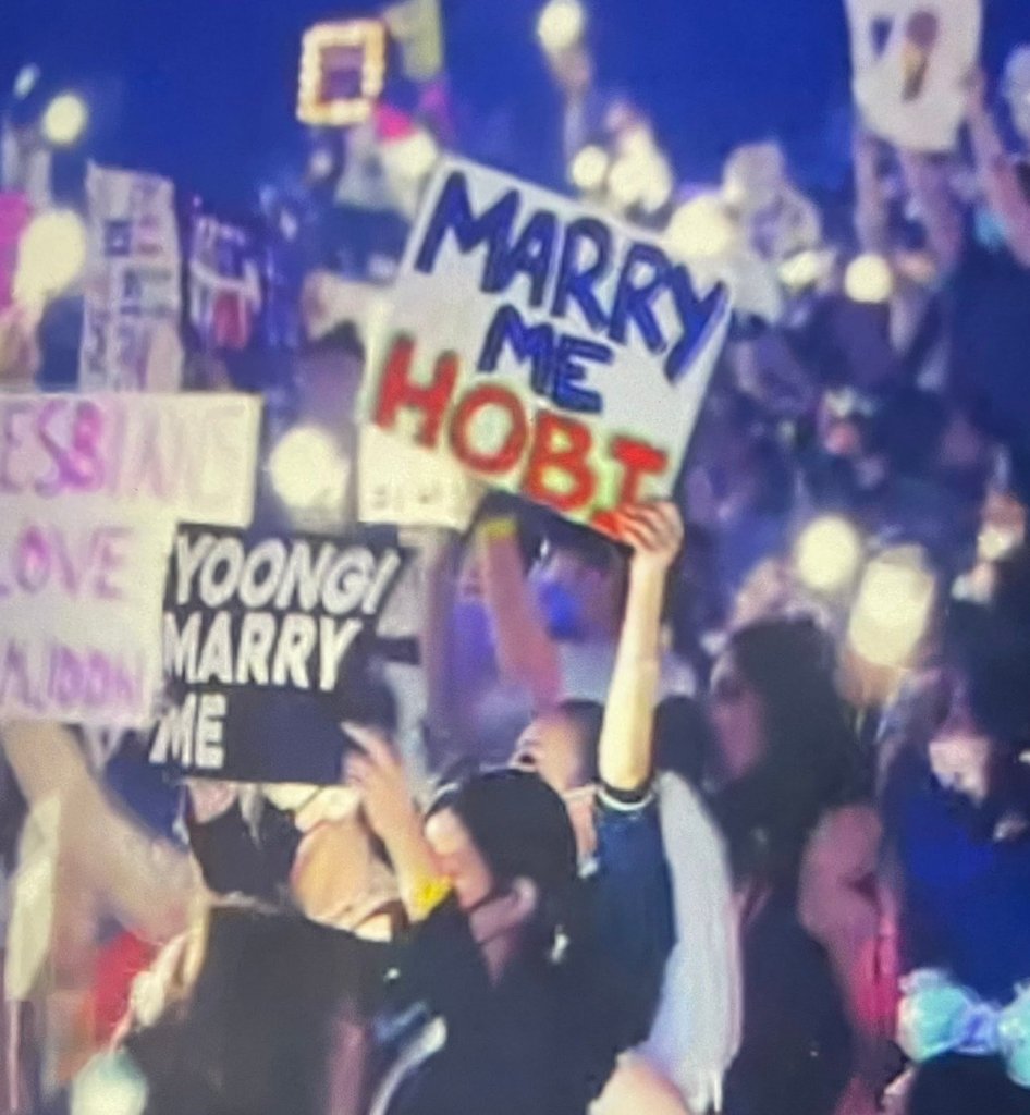 It was an unexpected surprise when they showed these signs on big sceeen as BTS spoke with ARMY. They showed “DADDY TAE” “Lesbians love Namjoon” “Yoongi I’ll be your tangerine” “Yoongi marry me’ “Papi jimin” “permission to call Namjoon daddy” “MARRY ME HOBI” “MARRY ME YOONGI” “LESBIANS LOVE NAMJOON” “Namjoon thank u 4 saving me!” “RM you inspire me!” “Bisexuals 4 joon” “We want to focus on *jungkook abs*” “Namjoon please chocke me wth your thighs”