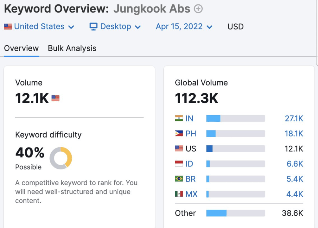 According to Semrush, the top three countries with the most searches for BTS and Jung Kook are: