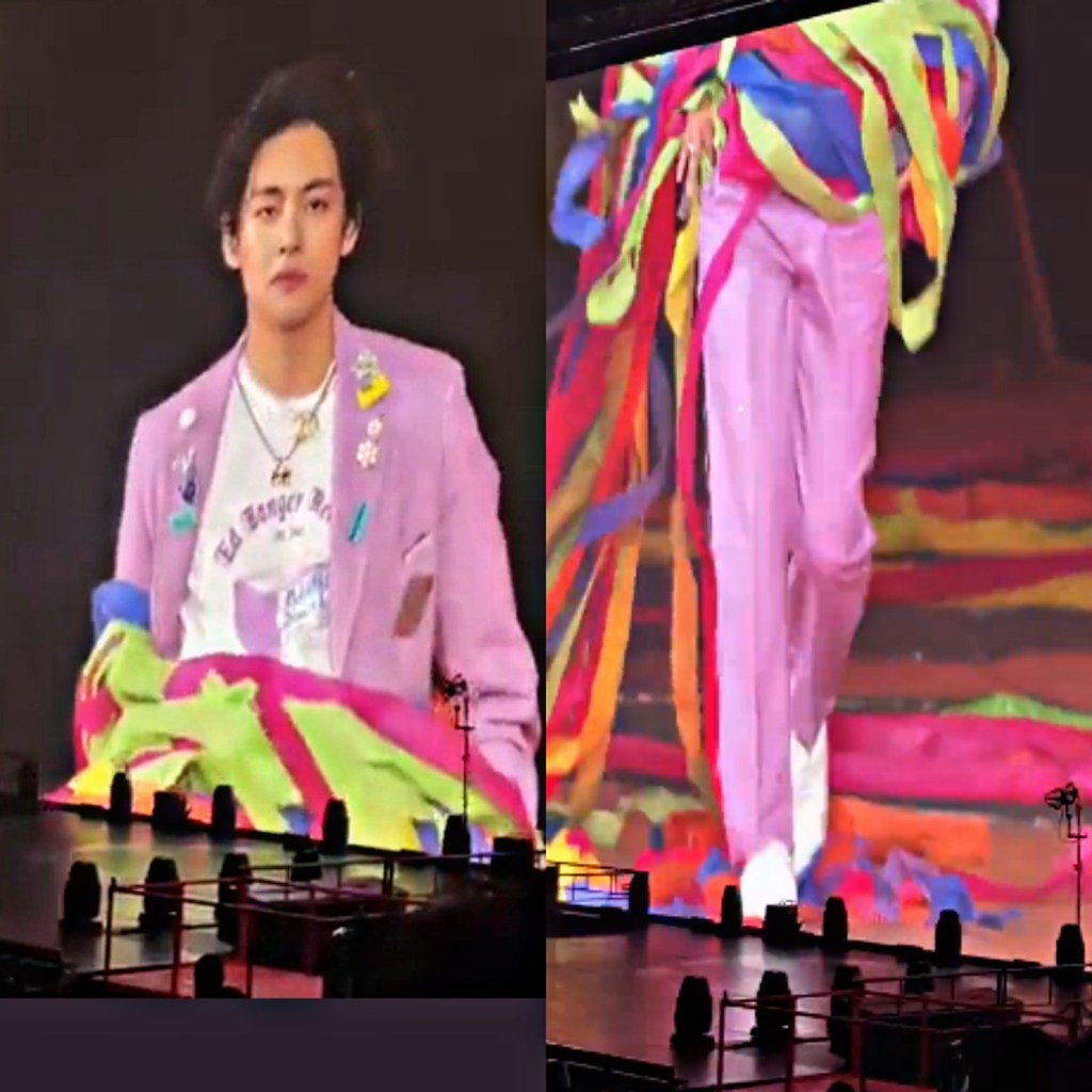 “BTS’ V is a versatile artist who is known for his many facial expressions while on stage. During their “Permission to dance on Stage concerts, V has maintained his playful side getting into character making jokes that made his fellow band members and fans laugh. He is a joker and always finds situations to immediately play into chracter. On day 3 of their 4 day concerts, V decided to make the stage his runway. Immediately the concert ended and ribbons staerted falling on the stage, he ran gathering them up.