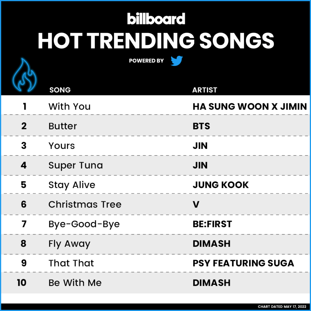 “For the second consecutive week Jimin and Han Sung-woon have maintained their top spot on the Billboard Hot Trending Songs Chart with over 3 million mentions. This time all the top 6 Positions are filled with BTS’ group song and their solo tracks. “Butter” maintained it’s no. 2 position, “Yours” and “Super Tuna” by Jin took no. 3 and 4 respectively. Jin has had his two songs on the top 10 list for several months now, proving just how much fans still love his solo OST and a song he released on his birthday that became an “accidental” hit. “