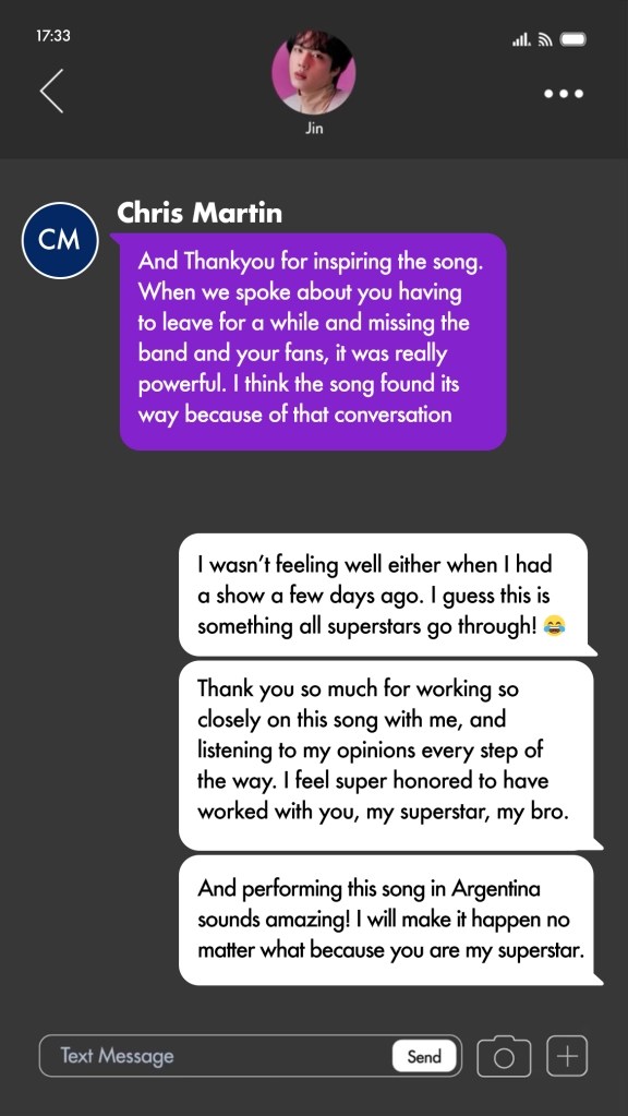 “Argentinian ARMYs are on cloud 9 at the moment. BTS’ Jin will be travelling to Argentina to perform with Coldplay his new single ” Astraunot” BTS’ official Twitter account revealed the news in a cute way. They shared screen shots of Jin and Chris Martin of Coldplay’s conversation.